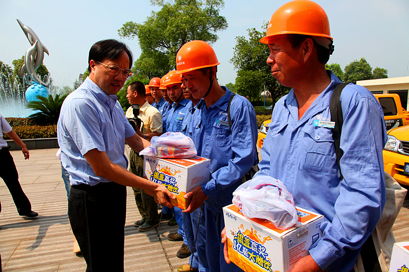 7月12日上午,縣委書記何加順、副縣長周樹森等縣委、縣政府領(lǐng)導(dǎo)來到供水公司慰問在高溫下作業(yè)的供水一線職工,親手把防暑降溫慰問品送到他們手上,并再三叮囑有關(guān)人員落實好夏季高溫時段的防暑降溫措施,確保一線職工身體健康。集團董事長倪阿泉、總經(jīng)理單寶子等領(lǐng)導(dǎo)陪同慰問。