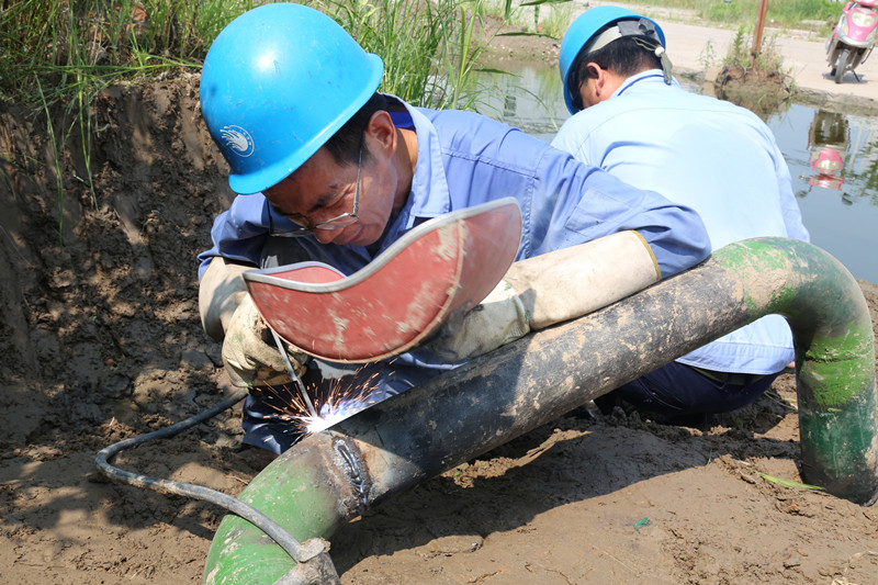 江濱水處理公司設(shè)備部作業(yè)人員正對(duì)排泥管道進(jìn)行搶修焊接作業(yè),焊接時(shí)火花四濺,溫度可以達(dá)到140℃左右。