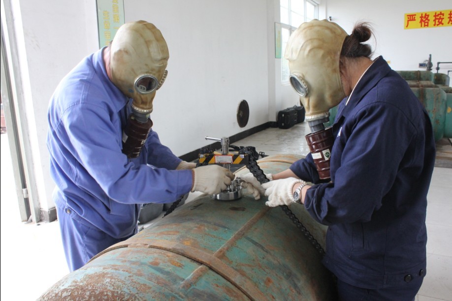 9名員工參與了此次演練。兩人一組,從新舊空氣呼吸器和防化服的正確穿戴及使用、泄氯堵漏工具的使用以及氯瓶拆裝三個項目進行技術演練。演練從實戰出發,參演人員各司其職,按照“正確、迅速”的原則,圓滿地完成了本次演練任務,最后公司運行部副經理對參演人員按標準進行了評分考核并發表總結講話。